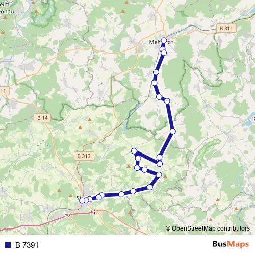 The first stop of the B 7391 bus route is Messkirch, Bahnhof and the last stop is Stockach (KN), Busbahnhof. B 7391 is operational during по будням.
