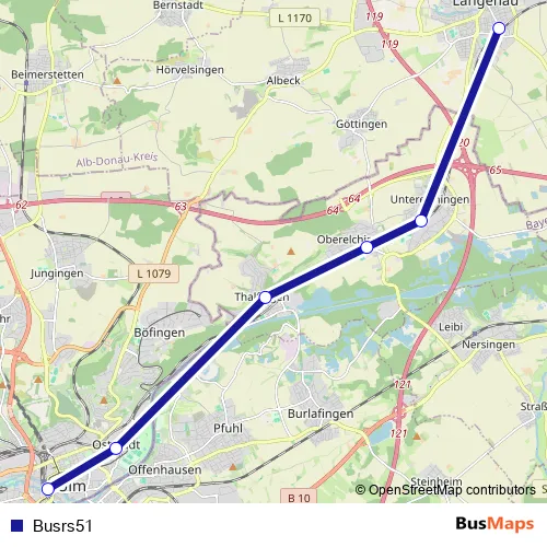 The first stop of the Busrs51 bus route is Bahnhof, Langenau (Württ) and the last stop is Zob, Ulm. Busrs51 is operational during по выходным.