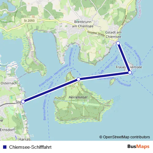 The first stop of the Chiemsee-Schifffahrt ferry route is Prien/Stock (Hafen) and the last stop is