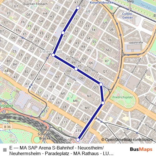 Click here to view the nearest E - MA SAP Arena S-Bahnhof - Neuostheim/Neuhermsheim - Paradeplatz - MA Rathaus - LU Rathaus - Berliner Platz - LU Rheingönheim tram stop.