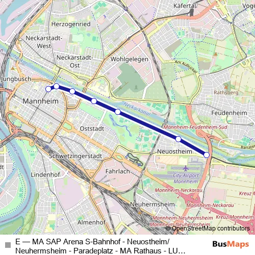Tram E - MA SAP Arena S-Bahnhof - Neuostheim/Neuhermsheim - Paradeplatz - MA Rathaus - LU Rathaus - Berliner Platz - LU Rheingönheim in Mannheim: Stops & Timetable