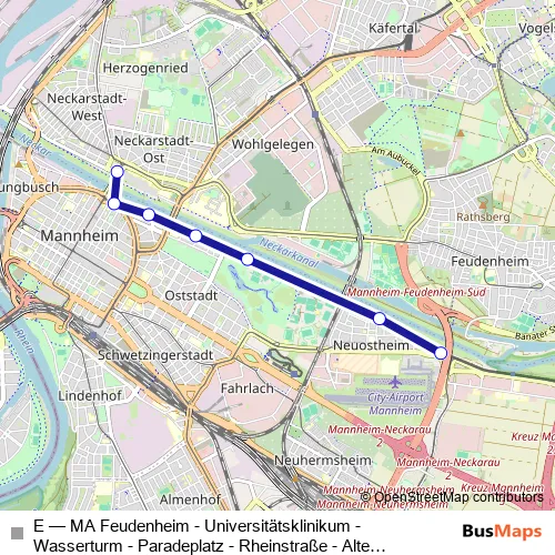 Tram E - MA Feudenheim - Universitätsklinikum - Wasserturm - Paradeplatz - Rheinstraße - Alte Feuerwache - MA Neckarstadt West: Full Schedule in Mannheim