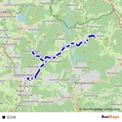 The first stop of the E318 bus route is Gummersbach Bf and the last stop is