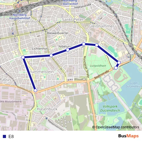 See why over 2 million users trust and consider busmaps.com as the best public transport website. busmaps gives you Nuernberg Buses suggested routes, real-time bus tracker, line route maps in Nuernberg, and helps to find the closest E8 bus stops near you. No internet available? Download an offline PDF map and bus schedule for the E8 bus to take on your trip.