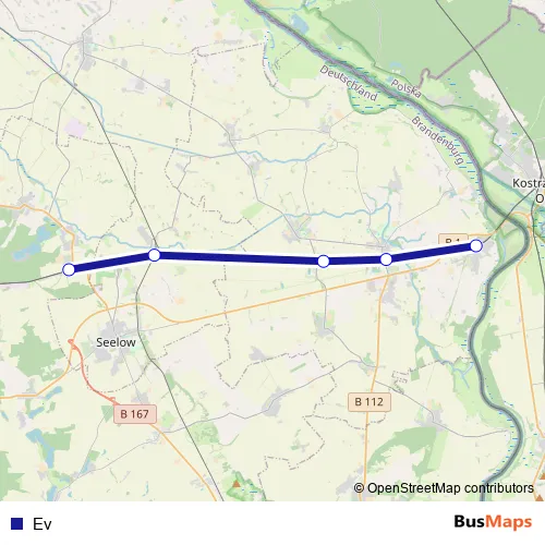 The first stop of the Ev bus route is Seelow-Gusow, Bahnhof and the last stop is