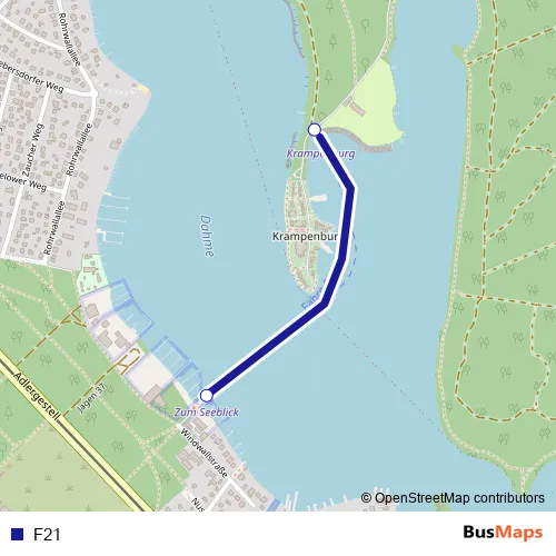The first stop of the F21 ferry route is Krampenburg (Berlin) and the last stop is Berlin, Zum Seeblick. F21 is operational during ежедневно.