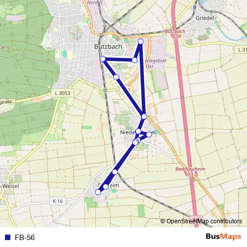 The first stop of the FB-56 bus route is Butzbach Bahnhof and the last stop is Butzbach Bahnhof. FB-56 is operational during ежедневно.