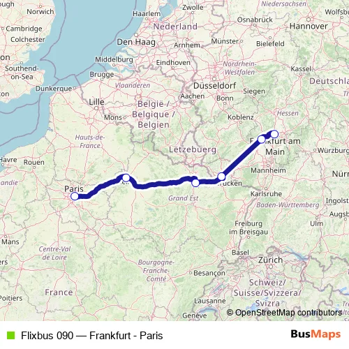 The first stop of the Flixbus 090 bus route is Frankfurt central train station and the last stop is Paris (Bercy Seine). Flixbus 090 (Frankfurt - Paris) is operational during ежедневно.