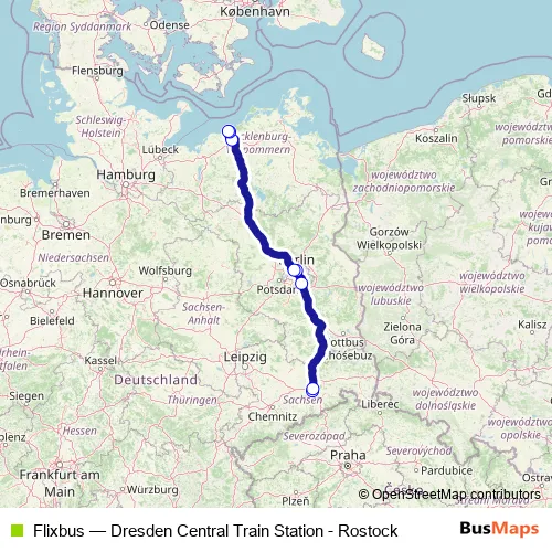 The first stop of the Flixbus bus route is Dresden Bayrische Strasse and the last stop is Rostock Parkstrasse. Flixbus (Dresden Central Train Station - Rostock) is operational during ежедневно.