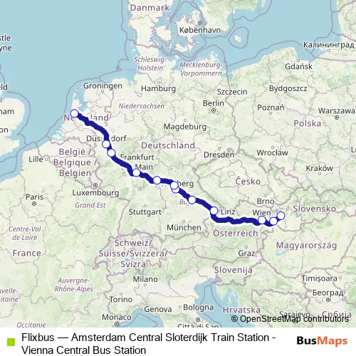 The first stop of the Flixbus bus route is Cologne / Bonn Airport Busterminal and the last stop is Amsterdam Piarcoplein P+R Sloterdijk. Flixbus (Amsterdam Central Sloterdijk Train Station - Vienna Central Bus Station) is operational during ежедневно.