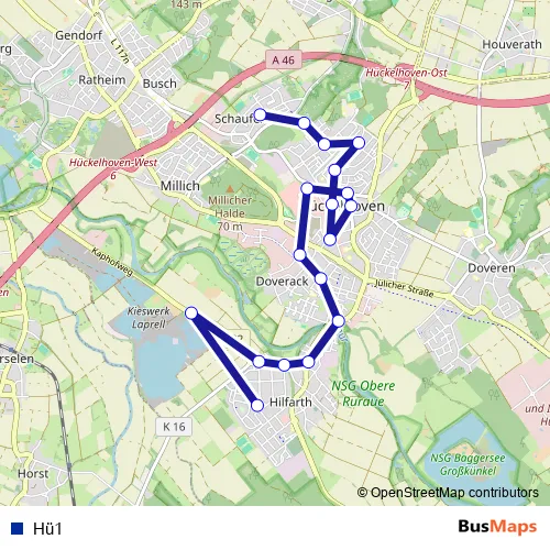 The first stop of the Hü1 metro route is Hückelhoven, Hilfarth Tannenstraße and the last stop is Hückelhoven, Schaufenberg Schule. Hü1 is operational during ежедневно.