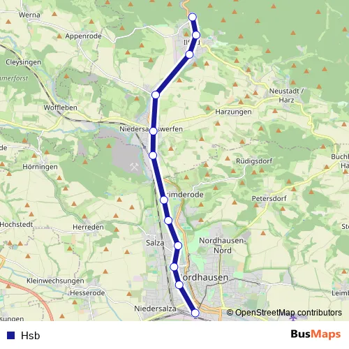 The first stop of the Hsb tram route is Ilfeld Neanderklinik and the last stop is Nordhausen, Bahnhofsplatz. Hsb is operational during ежедневно.