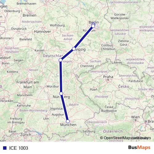 The first stop of the ICE 1003 rail route is Berlin Gesundbrunnen and the last stop is München Hbf. ICE 1003 is operational during ежедневно.