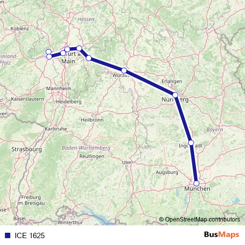 The first stop of the ICE 1625 rail route is Wiesbaden Hbf and the last stop is München Hbf. ICE 1625 is operational during ежедневно.