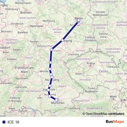 The first stop of the ICE 18 rail route is Berlin Gesundbrunnen and the last stop is