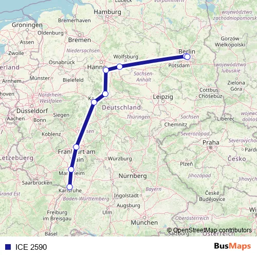 The first stop of the ICE 2590 rail route is Karlsruhe Hbf and the last stop is Berlin Ostbahnhof. ICE 2590 is operational during ежедневно.