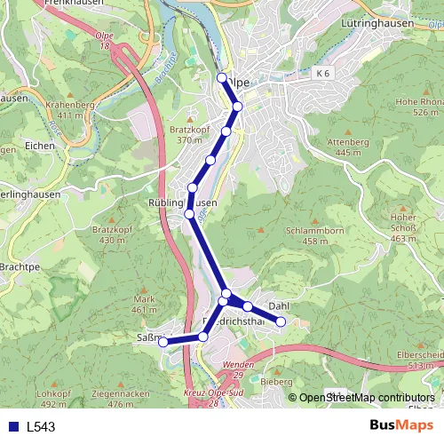 The first stop of the L543 bus route is Saßmicke Dorf and the last stop is Olpe Zob. L543 is operational during ежедневно.