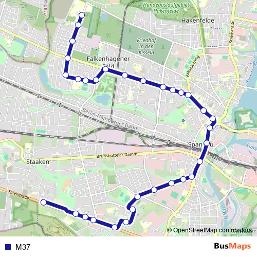 The first stop of the M37 bus route is Berlin, Waldkrankenhaus and the last stop is Berlin, Hahneberg. M37 is operational during ежедневно.