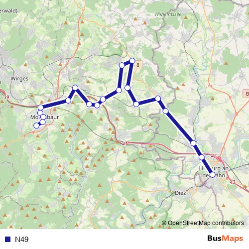 The first stop of the N49 bus route is Limburg (Lahn) ZOB West and the last stop is Montabaur Quartier Süd. N49 is operational during ежедневно.