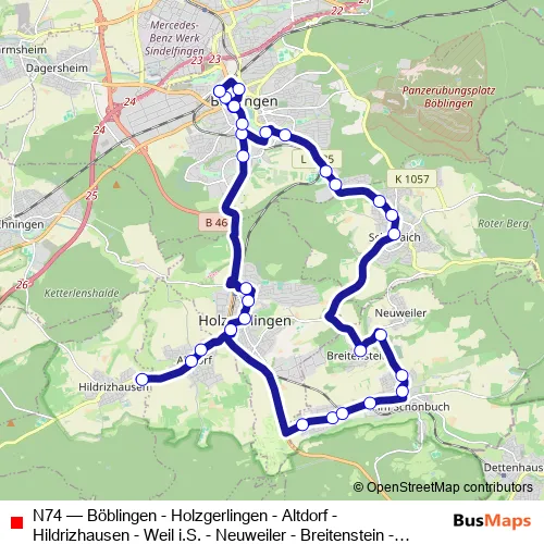 The first stop of the N74 bus route is Böblingen Zob and the last stop is Böblingen Zob. N74 (Böblingen - Holzgerlingen - Altdorf - Hildrizhausen - Weil i.S. - Neuweiler - Breitenstein - Schönaich- Böbl) is operational during по выходным.