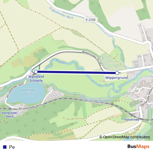 The first stop of the Pe rail route is Mansfeld Schleife and the last stop is