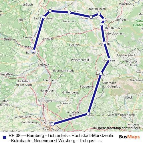 The first stop of the RE 38 rail route is Bamberg and the last stop is Nürnberg Hbf. RE 38 (Bamberg - Lichtenfels - Hochstadt-Marktzeuln - Kulmbach - Neuenmarkt-Wirsberg - Trebgast - Bayreuth - Pegnitz - Hersburck (re Pegn) - Nürnberg) is operational during ежедневно.