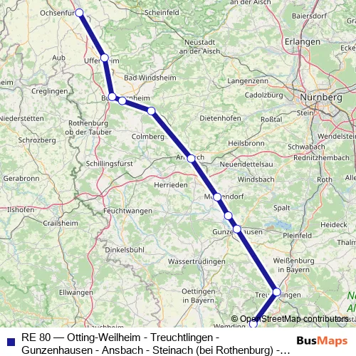 The first stop of the RE 80 rail route is Marktbreit and the last stop is Otting-Weilheim. RE 80 (Otting-Weilheim - Treuchtlingen - Gunzenhausen - Ansbach - Steinach (bei Rothenburg) - Marktbreit) is operational during ежедневно.
