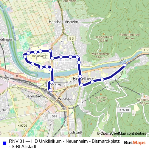 Click here to view the nearest RNV 31 - HD Uniklinikum - Neuenheim - Bismarckplatz - S-Bf Altstadt bus stop.