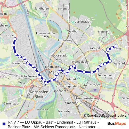 Tram RNV 7 - LU Oppau - Basf - Lindenhof - LU Rathaus - Berliner Platz - MA Schloss Paradeplatz - Neckartor - Nationaltheater - MA Vogelstang Erf. Strab: Full Schedule in Mannheim