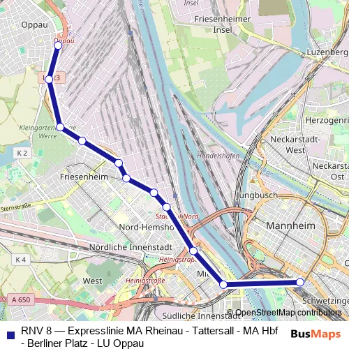 The first stop of the RNV 8 tram route is Oppau, Endstelle and the last stop is Mannheim, Hauptbahnhof. RNV 8 (Expresslinie MA Rheinau - Tattersall - MA Hbf - Berliner Platz - LU Oppau) is operational during по будням.