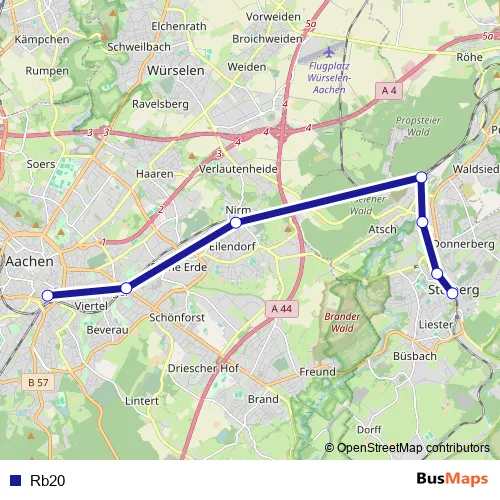 See why over 2 million users trust and consider busmaps.com as the best public transport website. busmaps gives you Aachen Buses suggested routes, real-time bus tracker, line route maps in Aachen, and helps to find the closest Rb20 bus stops near you. No internet available? Download an offline PDF map and bus schedule for the Rb20 bus to take on your trip.