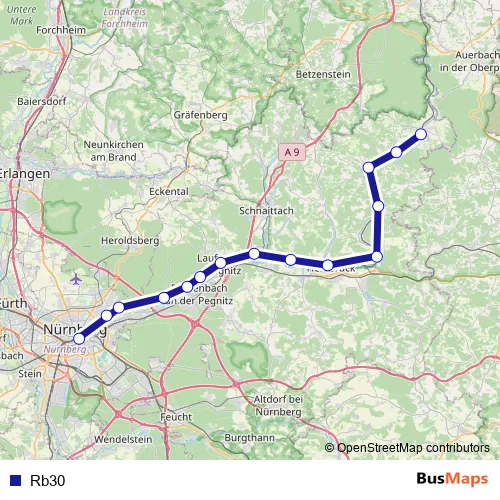The first stop of the Rb30 rail route is Nürnberg Hbf and the last stop is