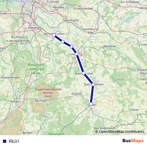 The first stop of the Rb31 bus route is Lüneburg and the last stop is