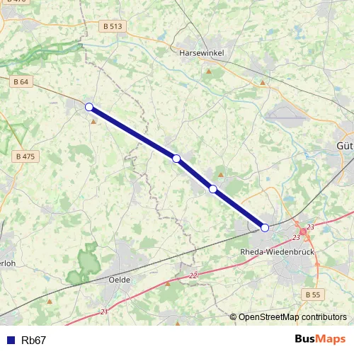 The first stop of the Rb67 bus route is RW-Rheda, Bahnhof and the last stop is