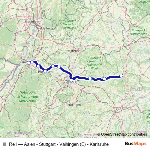 Click here to view the nearest Re1 - Aalen - Stuttgart - Vaihingen (E) - Karlsruhe rail stop.