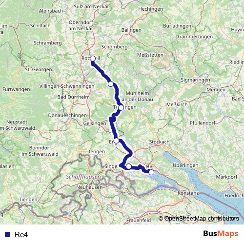 The first stop of the Re4 bus route is Tuttlingen Bahnhof Bstg A and the last stop is Radolfzell ZOB Bstg C. Re4 is operational during ежедневно.
