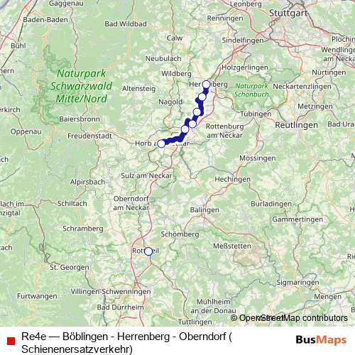 The first stop of the Re4e bus route is Herrenb. ZOB Bahnhofstraße and the last stop is Rottweil. Re4e (Böblingen - Herrenberg - Oberndorf (Schienenersatzverkehr)) is operational during по выходным.