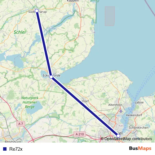 The first stop of the Re72x bus route is Kiel Hbf Kaistraße and the last stop is ZOB/Bahnhof, Süderbrarup. Re72x is operational during ежедневно.