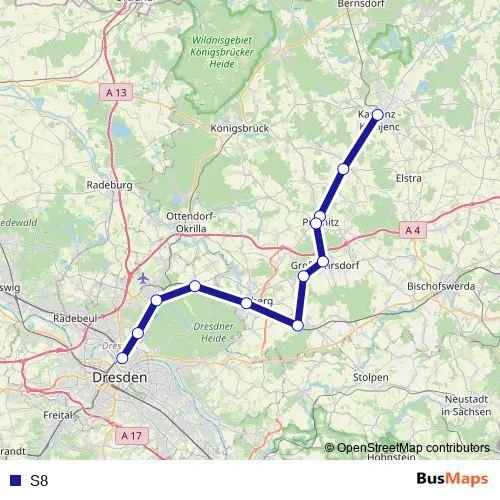 See why over 2 million users trust and consider busmaps.com as the best public transport website. busmaps gives you Dresden Buses suggested routes, real-time bus tracker, line route maps in Dresden, and helps to find the closest S8 bus stops near you. No internet available? Download an offline PDF map and bus schedule for the S8 bus to take on your trip.
