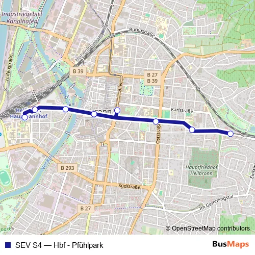 The first stop of the SEV S4 bus route is Heilbronn Hbf/Busbahnhof Bstg 5 and the last stop is Heilbronn Pfühlpark. SEV S4 (Hbf - Pfühlpark) is operational during ежедневно.