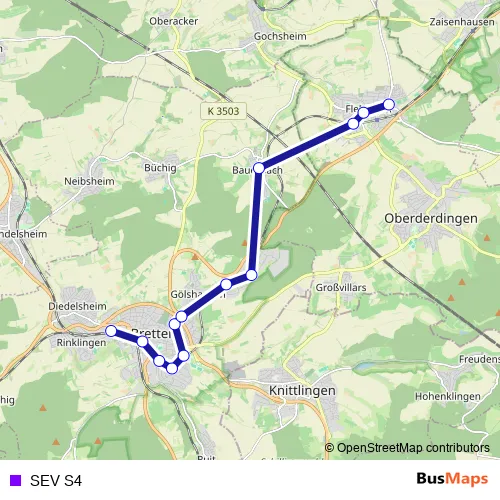 See why over 2 million users trust and consider busmaps.com as the best public transport website. busmaps gives you Bretten Buses suggested routes, real-time bus tracker, line route maps in Bretten, and helps to find the closest SEV S4 bus stops near you. No internet available? Download an offline PDF map and bus schedule for the SEV S4 bus to take on your trip.