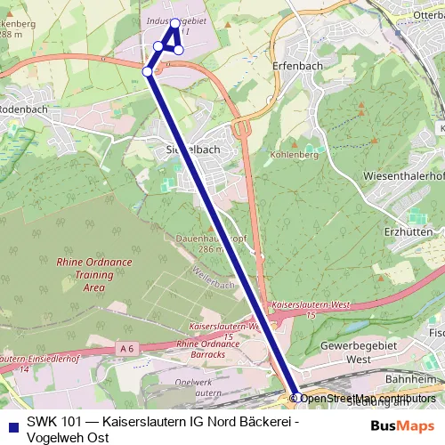 The first stop of the SWK 101 bus route is K'lautern, IG Nord Bäckerei and the last stop is Vogelweh, Ost. SWK 101 (Kaiserslautern IG Nord Bäckerei - Vogelweh Ost) is operational during по будням.
