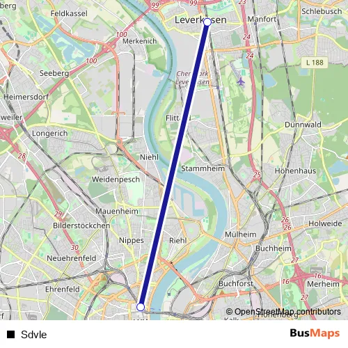 The first stop of the Sdvle rail route is Leverkusen Mitte Bf and the last stop is Köln Hbf. Sdvle is operational during ежедневно.