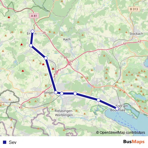 The first stop of the Sev rail route is Radolfzell Bahnhof and the last stop is