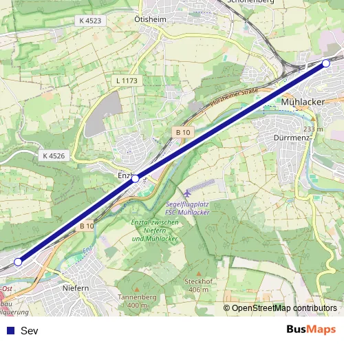 The first stop of the Sev rail route is Niefern Bahnhof and the last stop is Mühlacker Zob. Sev is operational during ежедневно.