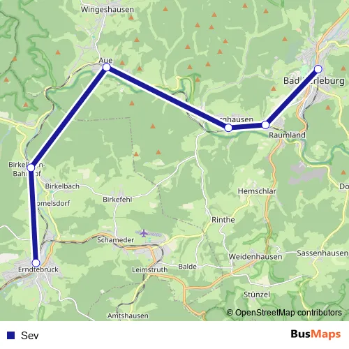 The first stop of the Sev bus route is Erndtebrück Bf and the last stop is