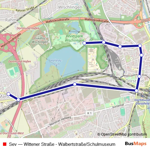 The first stop of the Sev bus route is DO-Walbertstraße/Schulmuseum and the last stop is Dortmund Wittener Straße. Sev (Wittener Straße - Walbertstraße/Schulmuseum) is operational during ежедневно.