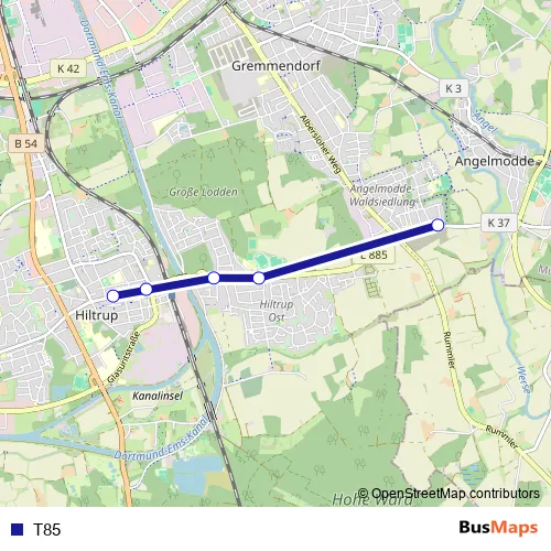 See why over 2 million users trust and consider busmaps.com as the best public transport website. busmaps gives you Muenster Buses suggested routes, real-time bus tracker, line route maps in Muenster, and helps to find the closest T85 bus stops near you. No internet available? Download an offline PDF map and bus schedule for the T85 bus to take on your trip.