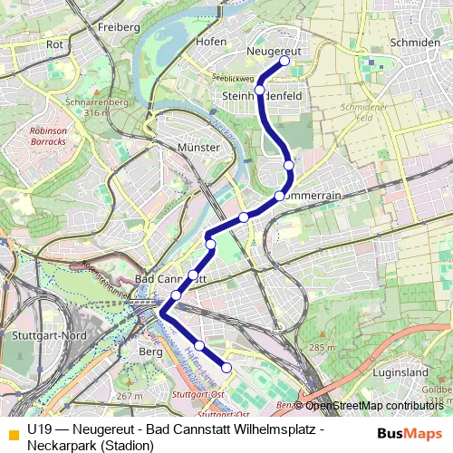 The first stop of the U19 metro route is Bad Cannstatt Wilhelmsplatz and the last stop is Neckarpark (Stadion). U19 (Neugereut - Bad Cannstatt Wilhelmsplatz - Neckarpark (Stadion)) is operational during ежедневно.