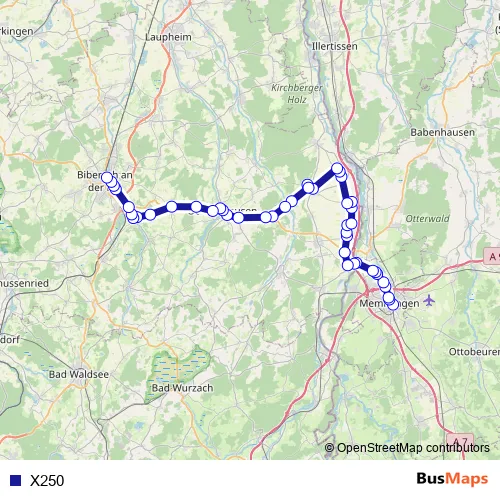 The first stop of the X250 bus route is Memmingen and the last stop is Biberach ZOB/Bahnhof. X250 is operational during ежедневно.